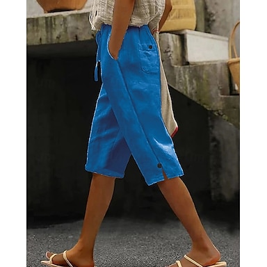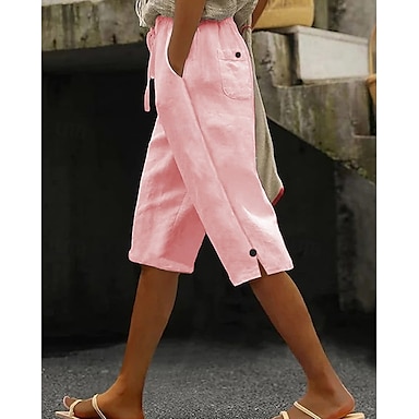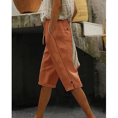 Damen Shorts aus Baumwollleinen Caprihose Stoffhosen Sommershorts Lässig Wadenlang Natürliche Taille Einfach Tasche Elastisches Kordelzugdesign Bequem Außenbereich Outdoor Ausgehen Rot orange Wei