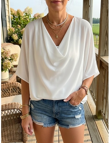 Damenbluse, elegante Oberteile, einfarbig, gerüscht, Fledermausärmel, 3/4-Ärmel, normale Oberteile, Wasserfallausschnitt, für die Arbeit, Alltag, Schwarz, Weiß, Gelb, Rosa, Himmelblau, Sommer,