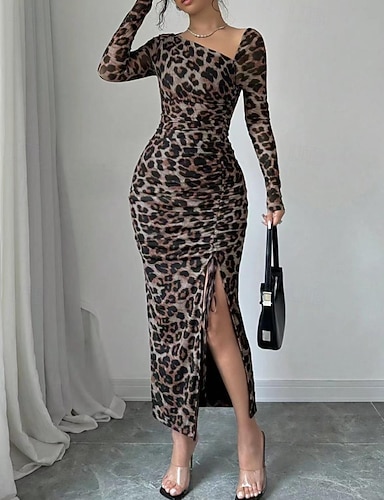 Damen Midikleid Etui-Kleid Druckkleid Modern Outdoor Urlaub Ferien Normale Passform Leopard Langarm Rundhalsausschnitt Rote Braun Khaki Herbst Winter