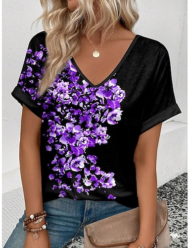 Damen T Shirt Druck Blumen Grafik Vintage Stilvoll Klassisch Kurzarm V Ausschnitt Normale Oberteile Täglich Wochenende Urlaubskleidung Blau Rote Purpur Grün Sommer Frühling