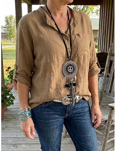 Womens Shirt Leinenähnlich Atmungsaktiv Leicht Knopfverschluss Tunika Hemdkragen Lange Ärmel Grafik Lässig Reguläre Oberteile Arbeit Täglich s Druck Rot Blau Grün Khaki Frühling Herbst Winter