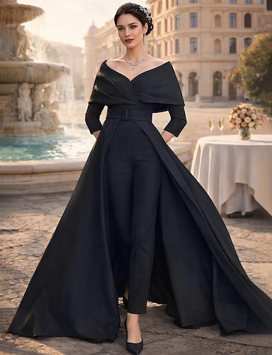 A-Linie Overall Hosenanzug Bodenlang Knöchellänge Brautmutterkleid Ärmellos Dreiviertelarm V Ausschnitt Elegant Einfach Minimalistisch Formell Hochzeitsgast Satin mit Schärpe / Band