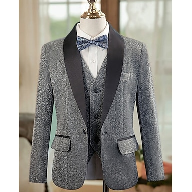 Ring-Träger Anzug Jungen Kinder Anzug Blazer & Weste & Hosen & Hemd & Krawatte Lässig Outdoor Party Mode Cool Basic Einfarbig Pailletten Tasche Knöpfe Grau Polyester