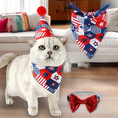 3-teiliges Haustier-Outfit zum 4. Juli inklusive Hut, Paillettenfliege und Schal, verstellbarem Stirnband für Kätzchen, Welpen, kleine Hunde und Katzen sowie Pflegeaccessoires für den