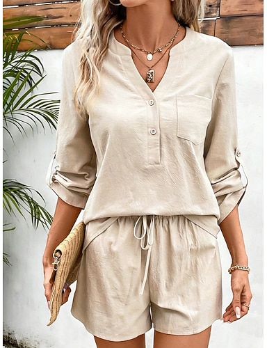 Damen Baumwoll-Leinen-Sets Shorts-Sets Langarm V Ausschnitt Einfach Kordelzug Elegant Mode Streetwear Lässig Täglich Outdoor Schwarz Rosa Orange Sommer Lässiger Schnitt