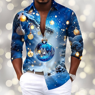 Weihnachten Herren Schneeflocke Weihnachtslicht Weihnachtskugeln Hemd Satinhemd Kleidhemd Langarm Modisch lässig Party Ferien Sommer Frühling Herbst Umlegekragen 3D-Druck Hemden mit Knopfleiste Blau