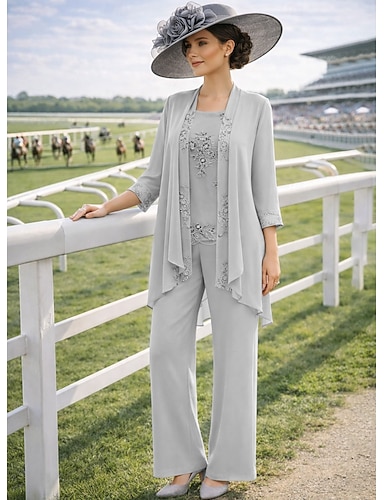 Dreiteilig Hosenanzug Bodenlang Brautmutterkleid Ärmellos Langarm Rundhalsausschnitt Elegant Einfach Formell Hochzeitsgast Hochzeitsfeier Chiffon Spitze mit Applikationen