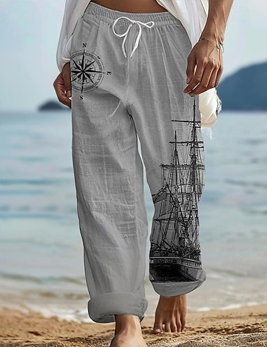 Herren Hose Baggy-Hosen Freizeithose Elastischer Kordelzug in der Taille Leinenähnliche Hose mit Taschen Geometrisch Pferd Wellen Volle Länge Outdoor Urlaub Strand Urlaub Retro Vintage Blau Grün