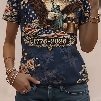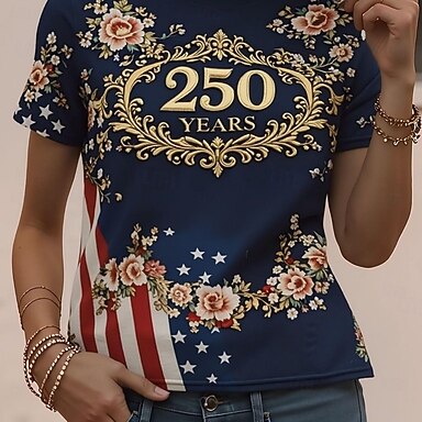 Amerikanischer Unabhängigkeitstag Damen T Shirt T-Shirt Druck Blumen Grafik Stilvoll Klassisch Lässig Kurzarm Rundhalsausschnitt Normale Oberteile Täglich Ausgehen Wochenende Blau Schwarz Weiß Rote