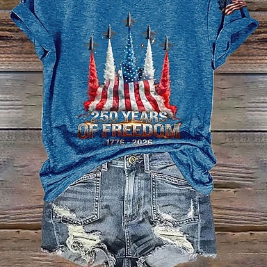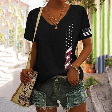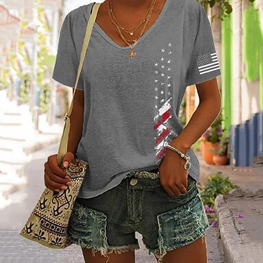 Amerikanischer Unabhängigkeitstag Damen T Shirt Druck Grafik Flagge Vintage Mode Lässig Kurzarm V Ausschnitt Normale Oberteile Täglich Blau Weiß Rote Sommer Frühling