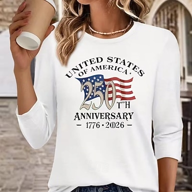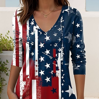 Amerikanischer Unabhängigkeitstag Damen T Shirt Druck Grafik Amerikanische Flagge Vintage Stilvoll Klassisch Langarm V Ausschnitt Normale Oberteile Täglich Wochenende Schwarz Weiß Rote Marineblau