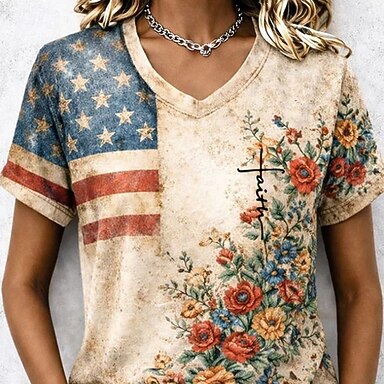 Amerikanischer Unabhängigkeitstag Damen T Shirt T-Shirt Druck Grafik Amerikanische Flagge Bohemien Vintage Stilvoll Kurzarm V Ausschnitt Normale Oberteile Täglich Ausgehen Wochenende Blau Rote Khaki
