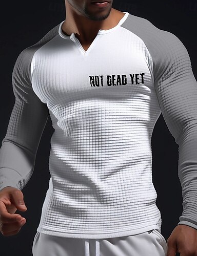 Herren-Shirt mit dem Aufdruck „Noch nicht tot“ – sportlich, motivierend, langärmelig, Henley-Raglan-Design, schmale Passform, Waffelstrick, strukturierte Oberfläche, ideal für Fitnessstudio, Training,