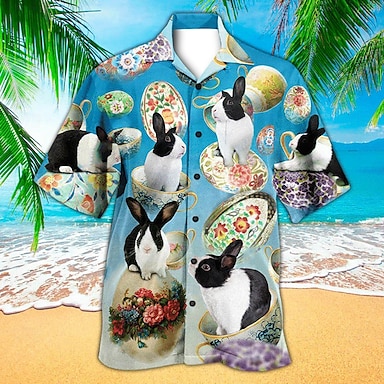 Ostern Herren Hase Osterei Hemd Kuba-Kragen-Hemd Knopfhemd Kurzarm Vintage-Retro Urlaub Ferien Festival Sommer Frühling Hemd mit Camp-Kragen 3D-Druck Blau