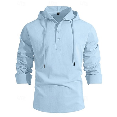 Herren Baumwoll-Leinen-Hemd T Shirt Henley Hemd Langarmshirt Langarm Mit Kapuze Frühling Herbst Einfach Mode Streetwear Lässig Kordelzug Knöpfe Täglich Urlaub Sport & Outdoor Schwarz Weiß Marineblau