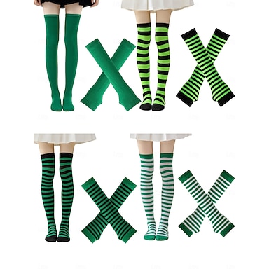 Socken für Damen zum St. Patrick's Day &Armstulpen-Set, 4-teilig, grün &Schwarz gestreifte Kniestrümpfe mit passenden fingerlosen Handschuhen, lustige Accessoires für irische Festivalkostüme für Damen