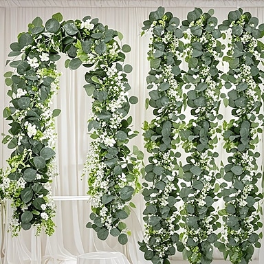 2/4-teiliges Set Eukalyptusgirlanden, Gesamtlänge 141,73 Zoll (ca. 360 cm), verziert mit weißen Blüten, Silberdollar-Blättern und naturgetreuen grünen Ranken, geeignet für Hochzeits- und