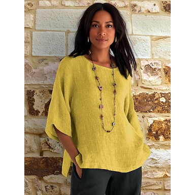 Damen Hemd Baumwoll Mischung Bluse Einfarbig Stilvoll Lässig Dreiviertelarm Rundhalsausschnitt Normale Oberteile Täglich Blau Gelb Rosa Grau Sommer Frühling