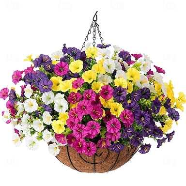 Künstliche Gartenblumen mit Hängeampeln, UV-beständige Kunstpetunien mit Hängepflanzgefäß für die Frühlingsdekoration von Haustür und Veranda.