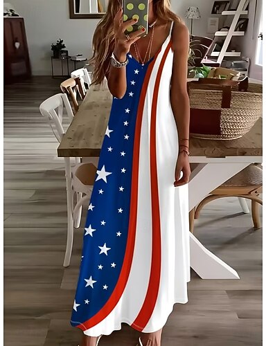 Unabhängigkeitstag Patriotische Damen Maxikleid A-Linie Kleid Spaghetti-Träger Kleid Urlaub Lässig Ausgehen Reguläre Passform Grafik Flagge Ärmellos V-Ausschnitt Spaghetti-Träger Blau Marineblau Navy
