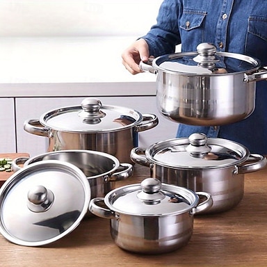 Edelstahl-Kochgeschirrset – robuster Küchentopf mit Deckel, polierter Innenwand, genietetem Griff und hitzebeständigem Knauf