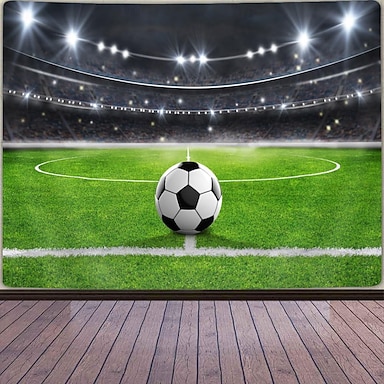 Wandteppich mit Fußballstadion-Motiv, professionelles Fußballfeld mit Ball im Hintergrund, für Sportfans, Wohnzimmerdekoration, stimmungsvolle Spielarena-Atmosphäre, Stoffwandbehang
