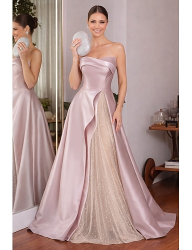 A-Linie Bodenlang Abendkleid Ballkleid Festliche Kleidung Elegant seidig Ärmellos Schulterfrei Hochzeit Formell Tasche Satin Paillettenbesetzt mit Falten Schlitz