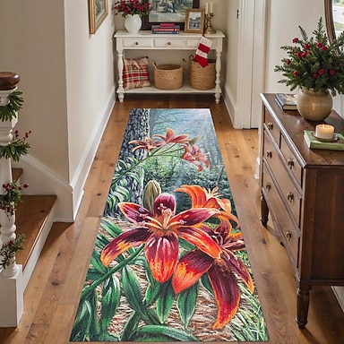 Lilienblumen Runner Teppich für Flur Küche Weich Rutschfest Maschinenwaschbar Faux Kaschmir Wald Natur Teppich Rot Orange BlüteDesign Eingangsbereich Runner Lilienfreude von Dakota Daetwiler