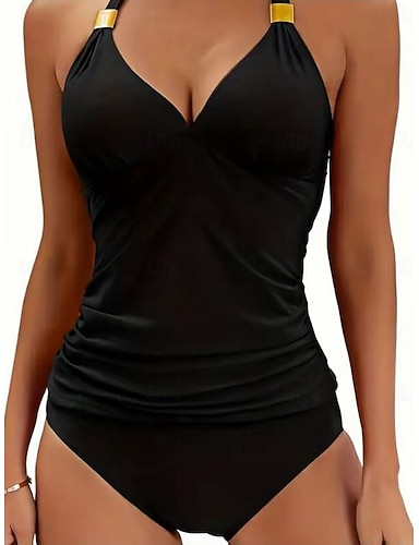 Damen Tankini 2-teiliges Badeanzug Rüsch Slip Bauch Kontrolle Hohe Taille Slim Rückenfrei Urlaub Strandbekleidung Einfarbiger Halter-Ausschnitt Ärmellos Badeanzüge