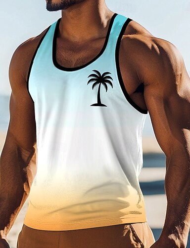 Herren-Tanktop mit minimalistischem, tropischem Hawaii-Strand-Ombré-Muster in Blau, Weiß und Gelb, ärmellos, U-Ausschnitt, für Sommerurlaub, Strand, Surfen, Freizeitkleidung, Größen S, M, L, XL, XXL