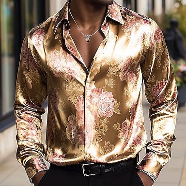 Herren Blumendruck Rose Blumen Hemd Satinhemd Kleidhemd Langarm Vintage-Retro Urlaub Alltagskleidung Sommer Frühling Herbst Umlegekragen 3D-Druck Hemden mit Knopfleiste Gold