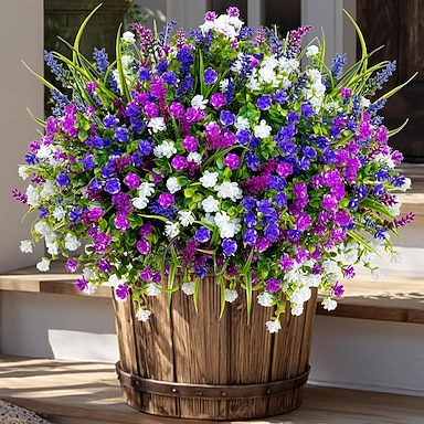 24 Bündel künstliche Blumen für den Außenbereich, UV-beständige Kunstblumen, Frühlingsblumen für Pflanzgefäße im Freien, Hochzeitsdekoration für Haus, Garten, Terrasse, Veranda (8 Farben)