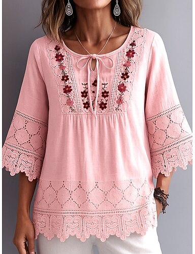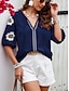 Damen Popover-Hemd Sommerhemd Freizeithemd Bluse Patchwork Lochmuster Einfarbig Urlaub Stilvoll Basic Dreiviertelarm V Ausschnitt Normale Oberteile Täglich Outdoor Ferien Blau Weiß Gelb Rote