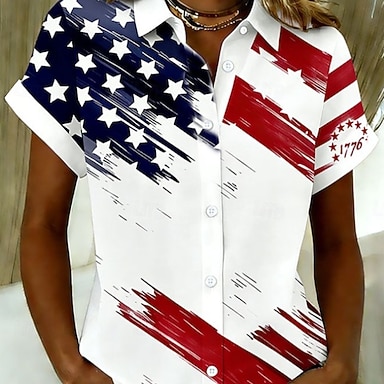 Unabhängigkeitstag Patriotische Damen Bluse Grafik Flagge Elegant Stilvoll 3/4 Länge Ärmel Rundhals Reguläre Tops Täglich Ausgehen Rüsche Knöpfe Weiß Rot Sommer Frühling