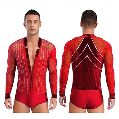 Herren roter Strass-Lateintanz-Body mit tiefem V-Ausschnitt, Netzstoff und langen Ärmeln, Ballsaal-Auftrittskostüm