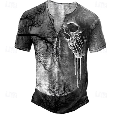 Herren T Shirt Henley Shirt Totenkopf Motiv Grafik-Drucke Henley Schwarz Armeegrün Braun Khaki 3D-Druck Outdoor Casual Kurzarm Button-Down Bedruckt Bekleidung Stilvoll Leicht Vintage Atmungsaktiv