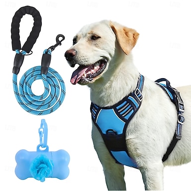 4-teiliges Set bestehend aus Hundegeschirr und -leine, passender Leine und Kotbeutelspender. Dieses zug- und würgefreie Geschirr im Oxford-Westen-Design verfügt über einen praktischen Griff.