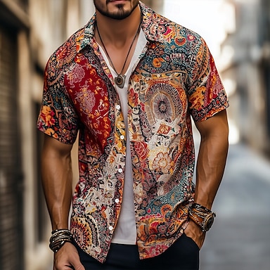 Herren Retro Indianer Boho Hemd Sommer Hawaiihemd Knopfhemd Kurzarm Hawaiianisch Urlaub Ferien Strandbekleidung Sommer Frühling Umlegekragen 3D-Druck Hemden mit Kragen Rote