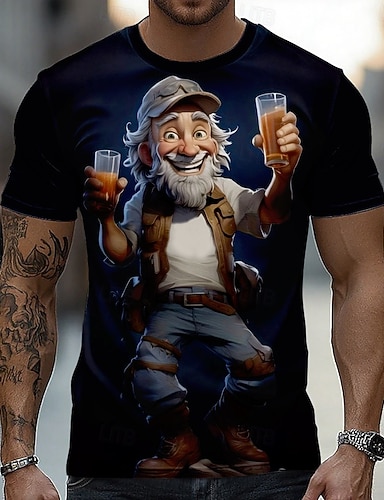 Herren-T-Shirt mit fröhlichem, altem Mann und zwei Biergläsern – 3D-Cartoon-Opa-Figur, humorvoll, animiert, Kurzarm, normale Passform, Geschenk für Partys, Bars, Clubs, Designer-Kleidung