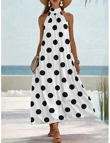 Damen Maxikleid Freizeitkleid Boho Chic Kleider Bohemien Urlaub Tropisch Strand Ferien Date Normale Passform Grafik Tupfen Böhmische Ärmellos Neckholder Schwarz und Weiß Weiß Gelb Hellgrün Sommer