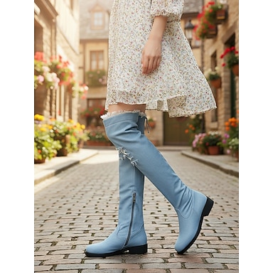 Hellblaue Overknee-Stiefel aus Denim für Damen – Used-Look-Jeansstiefel mit Rissen, seitlichem Reißverschluss und seitlichem Schaft für lässige Streetwear und Konzerte
