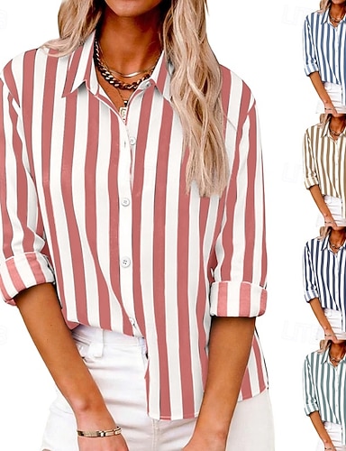 Damen Hemd Baumwoll-Leinen-Hemden Bluse Patchwork Knöpfe Gestreift Stilvoll Klassisch Modern Langarm Hemdkragen Normale Oberteile Täglich Ferien Ausgehen Blau Rosa Grün Khaki Dunkelblau Sommer