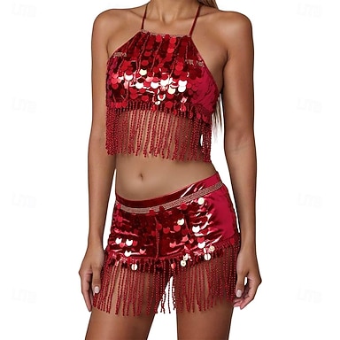 Samba Dancewear Damen 2-teiliges Pailletten Bauchtanzrock-Set Fransen Hüftschal mit Halter-Bra-Tops Leistungskostüm