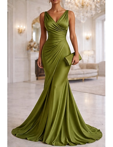 Meerjungfrauenschnitt Bodenlang Abendkleid Elegant Ärmellos V Ausschnitt Hochzeit Formell Rosa Kleid Stretch Satin mit Falten