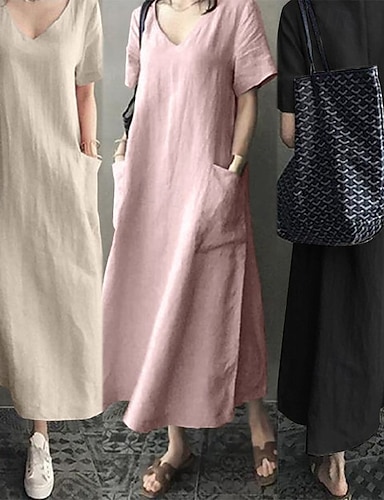 Frauen Leinenähnliche Faux Baumwoll Leinen Maxi Kleid Etuikleid Shift Kleid Sommer Kleid Urlaub Party Lässig Alltäglich Büro Party Lockerer Schnitt Unifarben Kurzarm V-Ausschnitt Schwarz Pink
