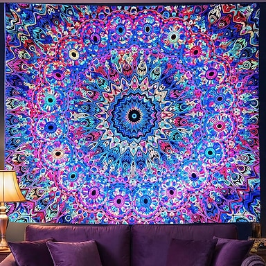 Schwarzlicht-Wandteppich mit aufwendigem Mandala-Design in leuchtenden, fluoreszierenden Farben – UV-reaktiver Wandbehang im Bohème-Stil für Schlafzimmer, Wohnzimmer, Studentenwohnheim und Partyräume