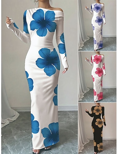 Damen Maxikleid Etui-Kleid Lässig Outdoor Ausgehen Schmale Passform Blumen Grafik Langarm Rundhalsausschnitt Blau Schwarz Rosa Purpur Sommer Frühling Herbst