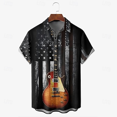 Herren Optische Täuschung Blitz Gitarre Hemd Sommerhemd Knopfhemd Kurzarm Modisch lässig Outdoor Urlaub Musikfestival Sommer Frühling Umlegekragen 3D-Druck Hemden mit Kragen Eine Tasche vorne Schwarz