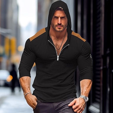 Herren Viertel-Zip T-Shirt T-Shirt Langarmshirt Langarm Mit Kapuze Sommer Herbst Patchwork Täglich Lässig Streetstyle Reißverschluss Outdoor Straße Lässig Schwarz Marineblau Kaki Top T-Shirt für