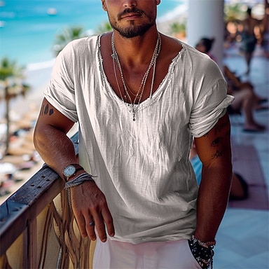Herren Hemd Hemd aus Baumwollleinen Weißes Baumwollhemd Lässiges Hemd Glatt Hawaiianisch Festtage Schwarz Weiß Gelb Marineblau 3/4-Ärmel V Ausschnitt Frühling Sommer Bekleidung